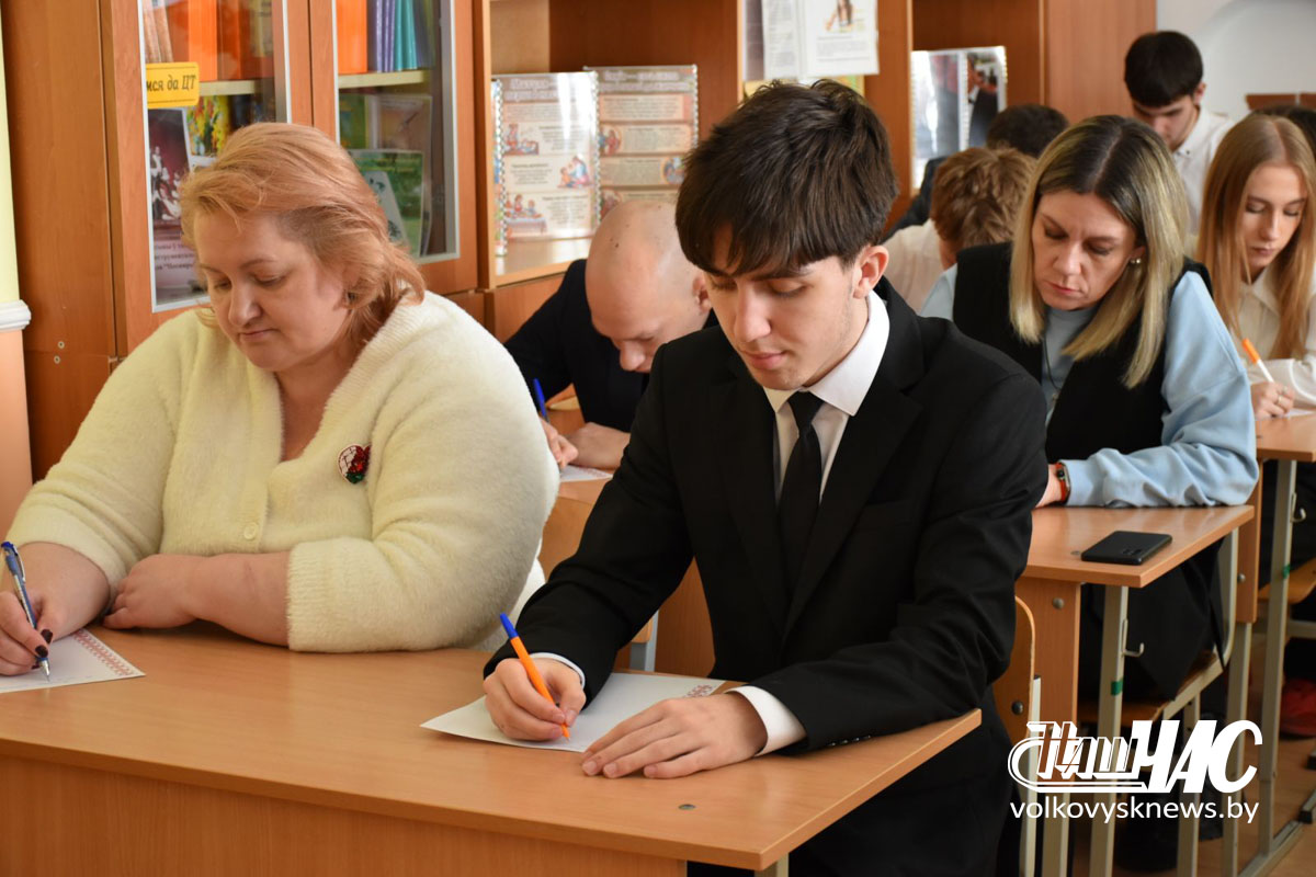 Педагогі і навучэнцы ўстаноў адукацыі Ваўкавыскага раёна сталі актыўнымі яе ўдзельнікамі.  Мы зазірнулі ў СШ № 5 г. Ваўкавыска, дзе настаўнікі і вучні не засталіся ў баку ад удзелу ў патрыятычным мерапрыемстве і пісалі дыктоўку разам з усёй краінай. Пачатак напісання быў запланаваны на 13.00, аднак удзельнікі прыходзілі загадзя, каб заняць месцы і настроіцца на работу.