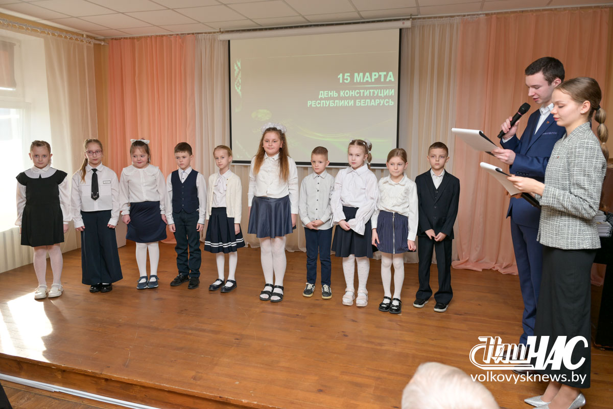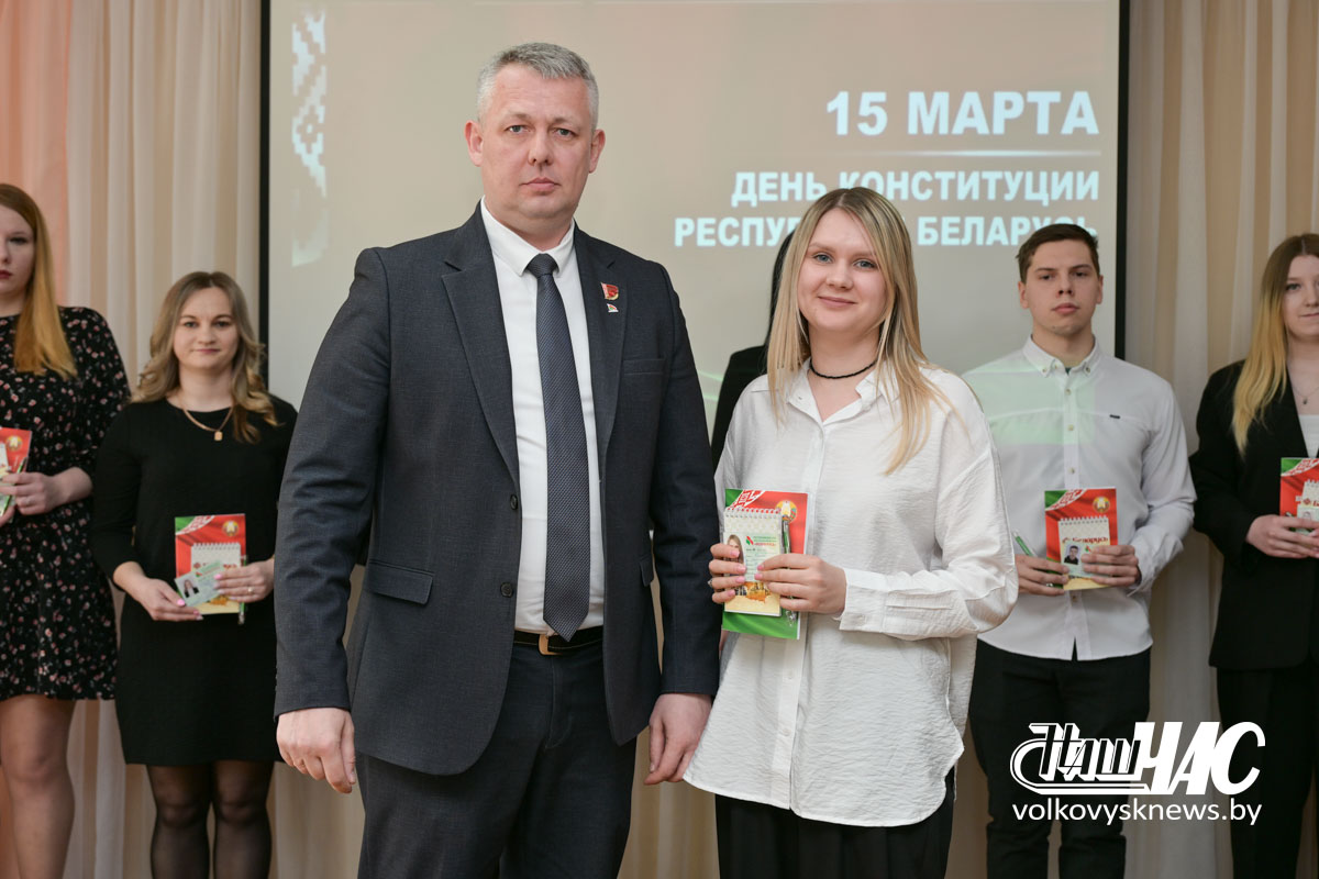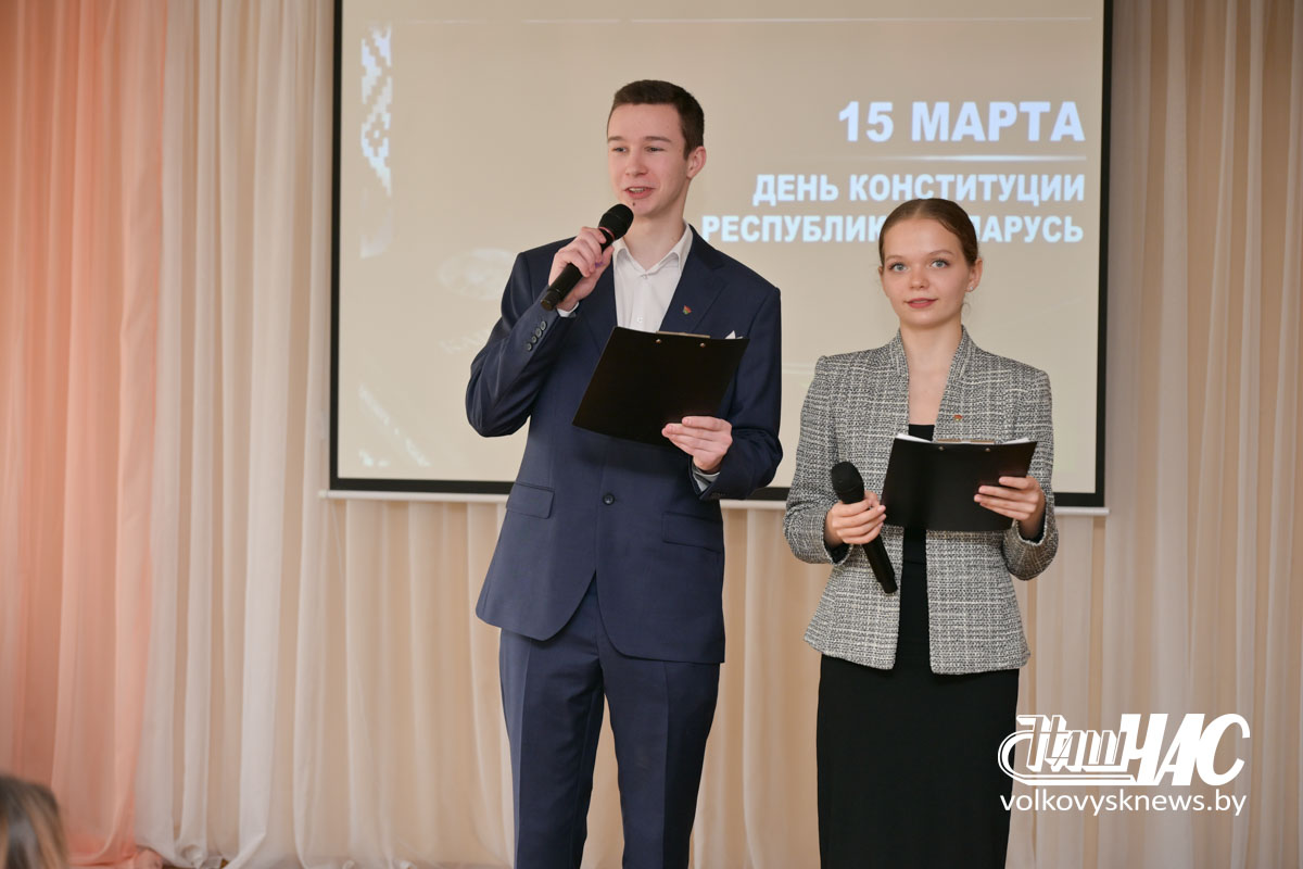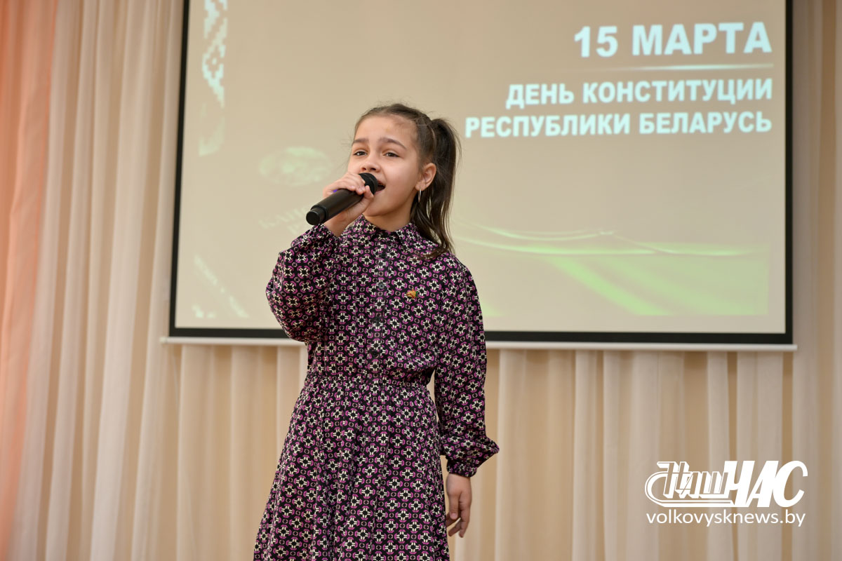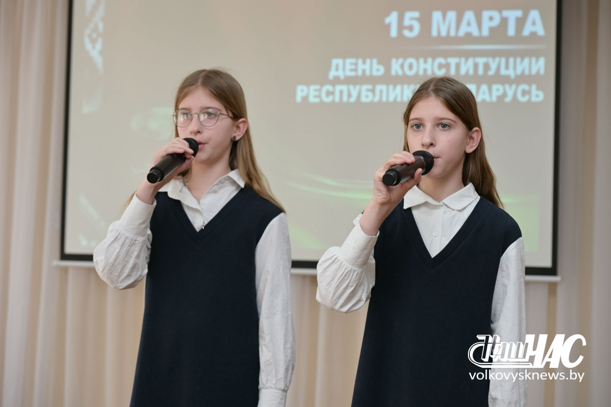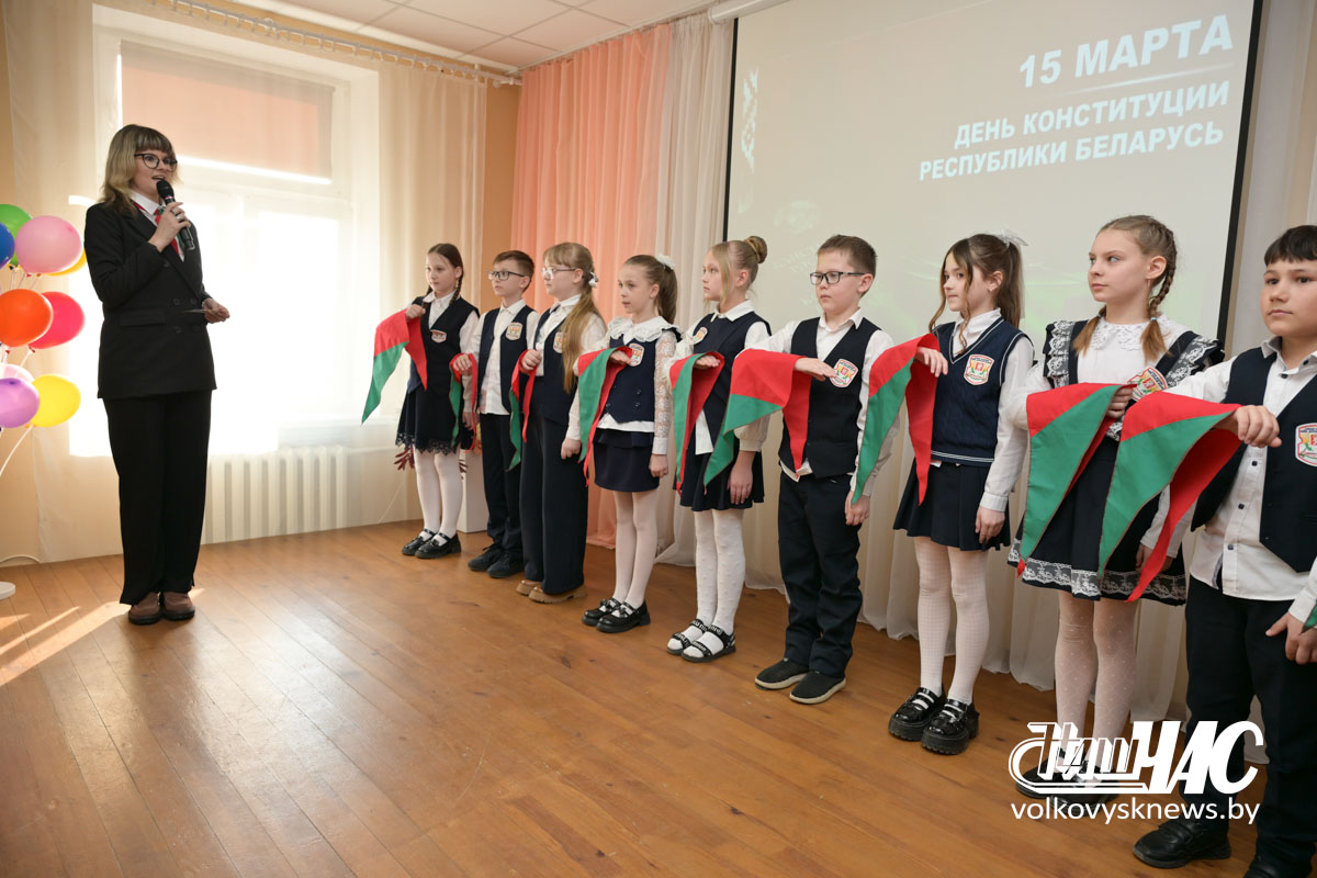 Районная акция «Мы — едины!», приуроченная к Дню Конституции, объединила волковычан всех возрастов — от младших школьников до ветеранов труда. В мероприятии приняли участие почетные гости: заведующий сектором воспитательной и социальной работы управления образования райисполкома Ирина Павлович, главный редактор районной газеты «Наш час», председатель районной организации республиканского общественного объединения «Белая Русь» Дмитрий Юшин, председатель Волковысской районной организации ветеранов Тамара Лугович, член президиума этой организации Игорь Мацейко, первый секретарь РК ОО «БРСМ» Наталья Климчук, председатель Волковысского районного совета ОО «БРПО» Анна Тимошко.