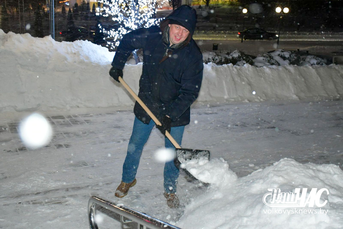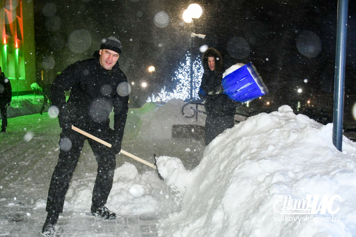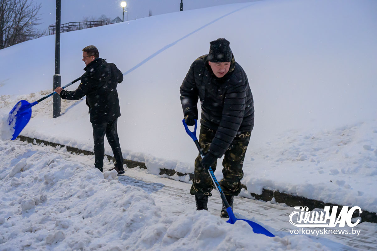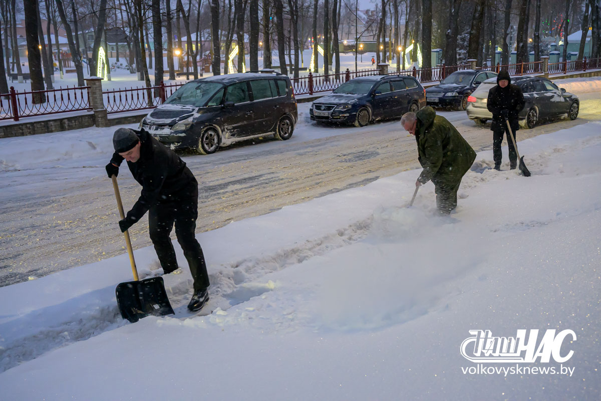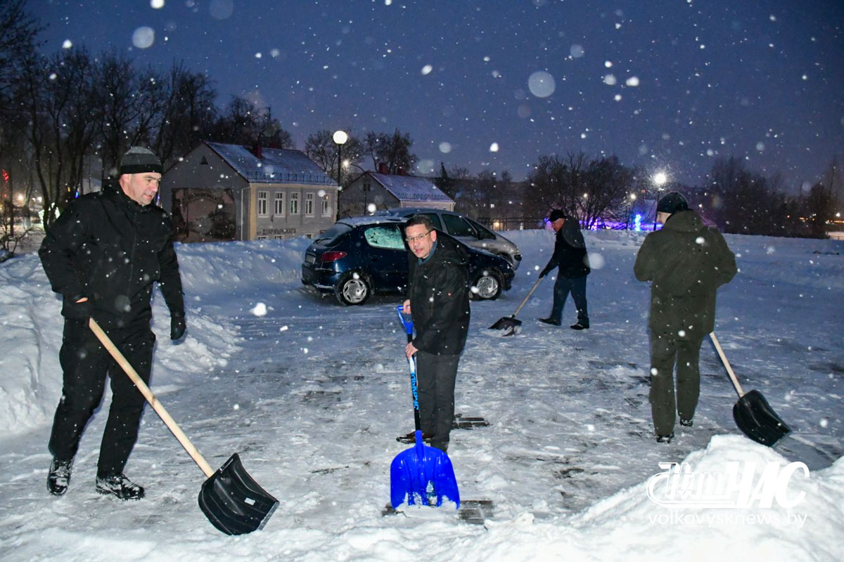 Еще затемно, в самом начале рабочего дня, на улицу вышли и работники Волковысского райисполкома во главе с членом Совета Республики Национального собрания Республики Беларусь, председателем райисполкома Дмитрием Захарчуком. Вооружившись лопатами, они расчистили территорию не только возле здания райисполкома — пошли дальше, освободив от снежных завалов тротуары перед зданием детской школы искусств и городским парком.