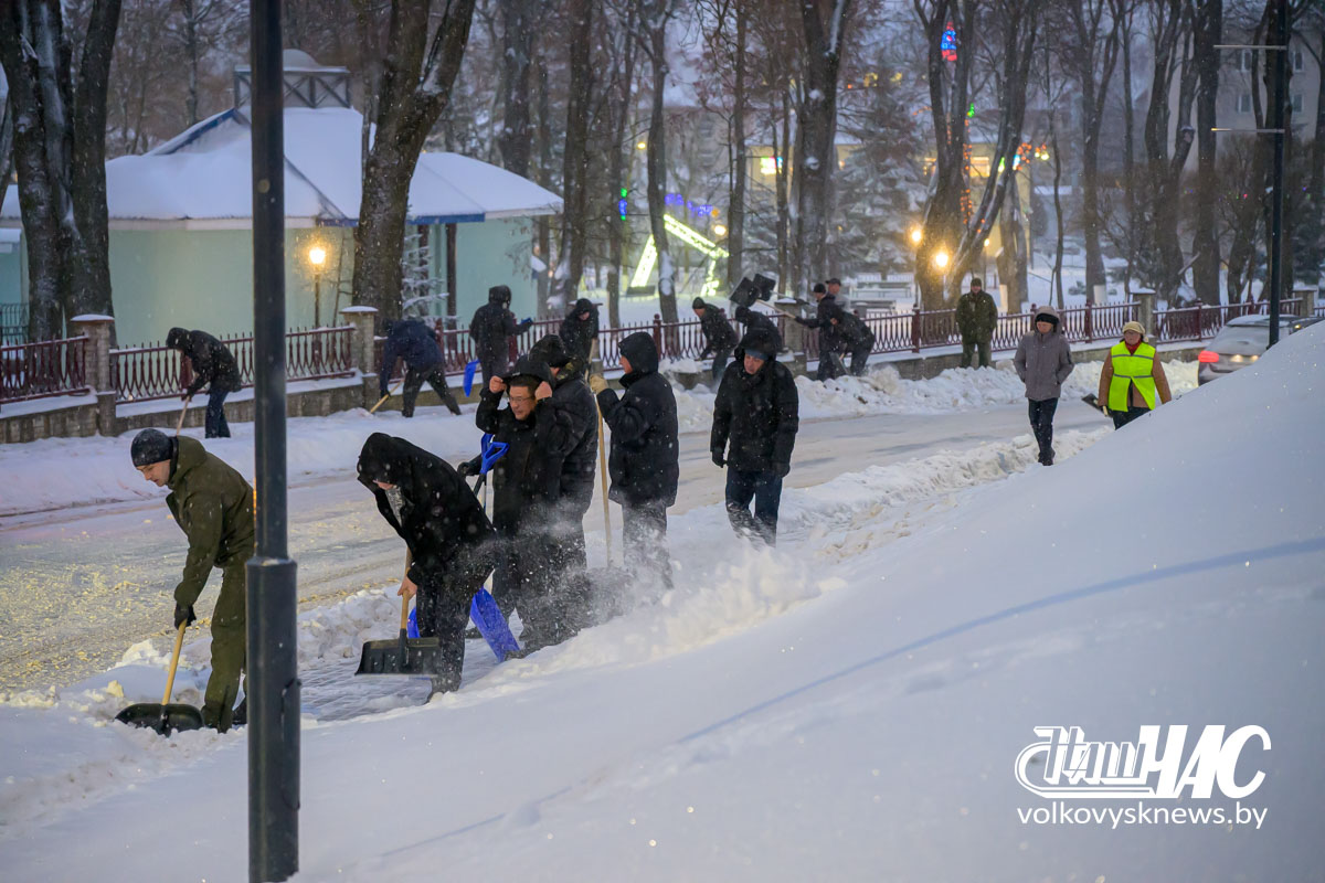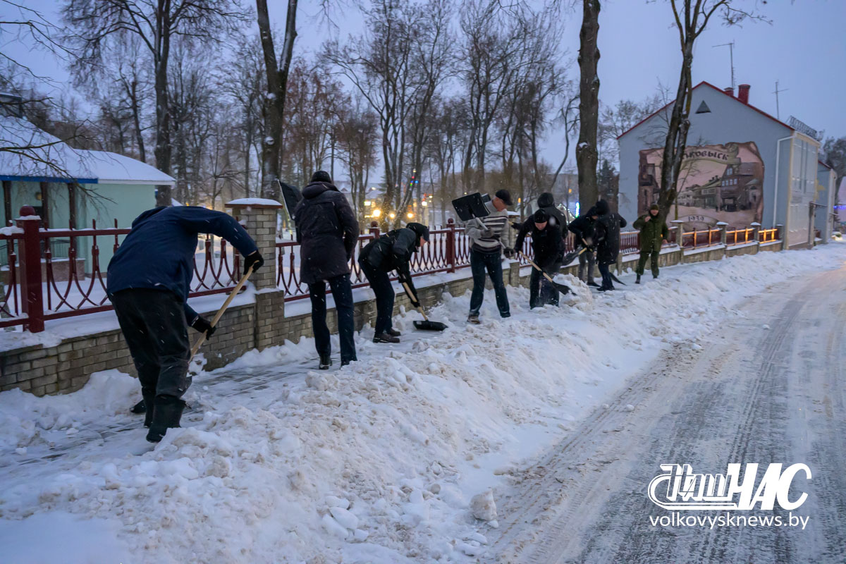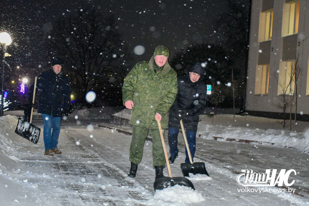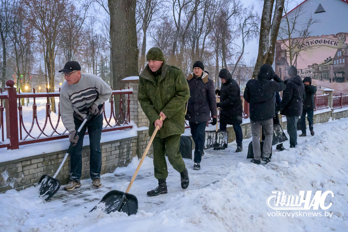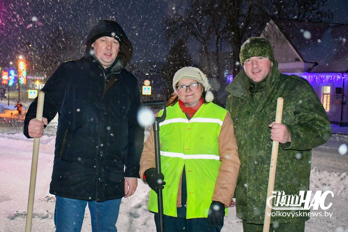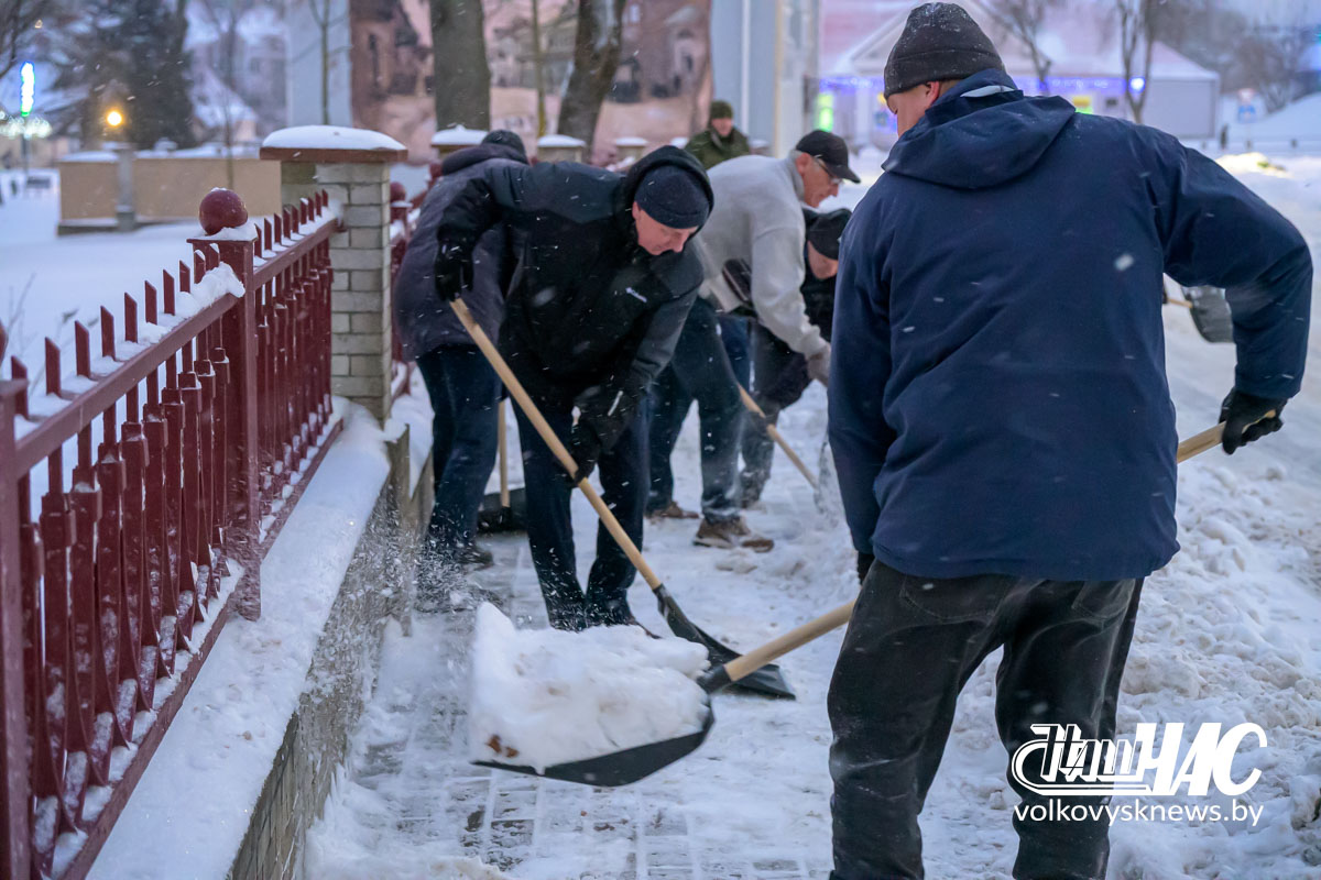 Еще затемно, в самом начале рабочего дня, на улицу вышли и работники Волковысского райисполкома во главе с членом Совета Республики Национального собрания Республики Беларусь, председателем райисполкома Дмитрием Захарчуком. Вооружившись лопатами, они расчистили территорию не только возле здания райисполкома — пошли дальше, освободив от снежных завалов тротуары перед зданием детской школы искусств и городским парком.