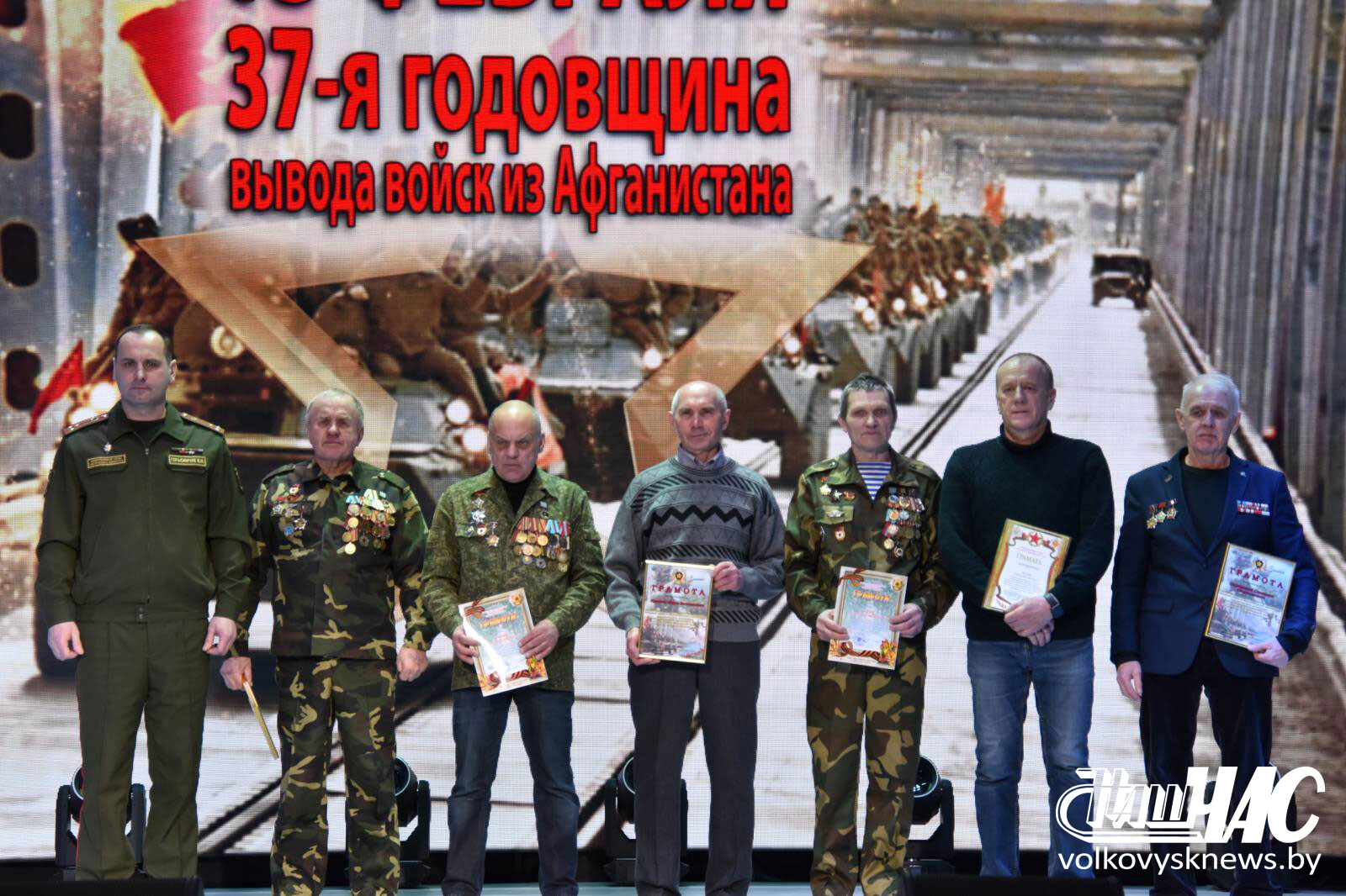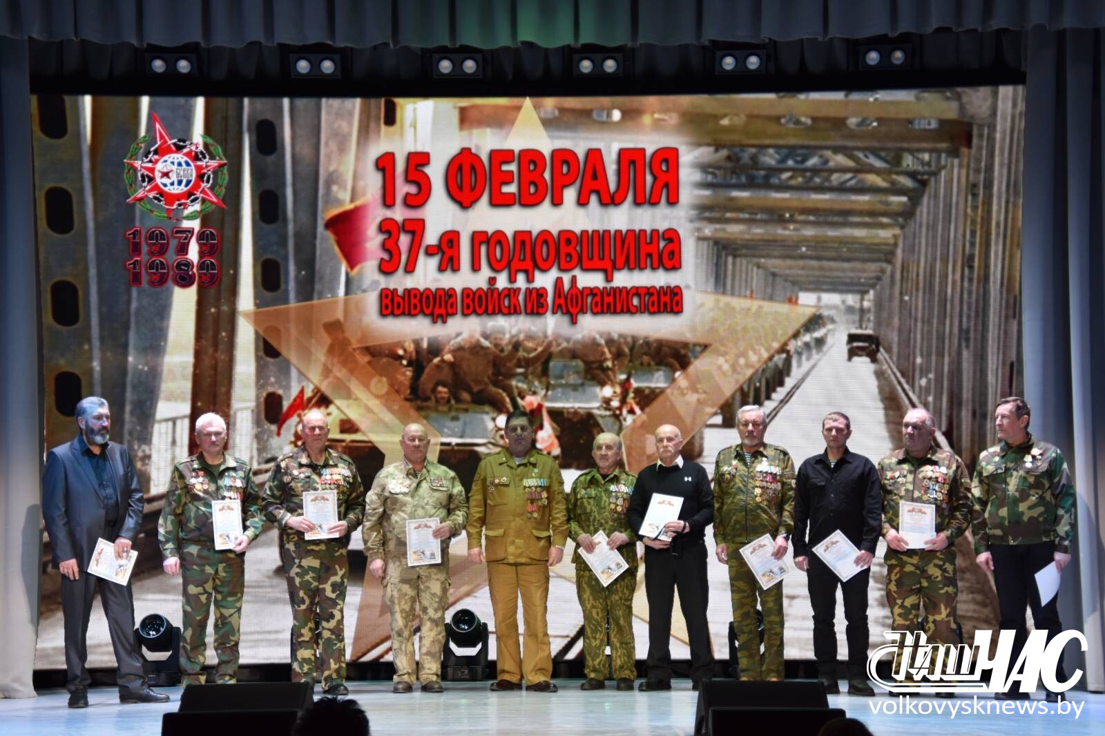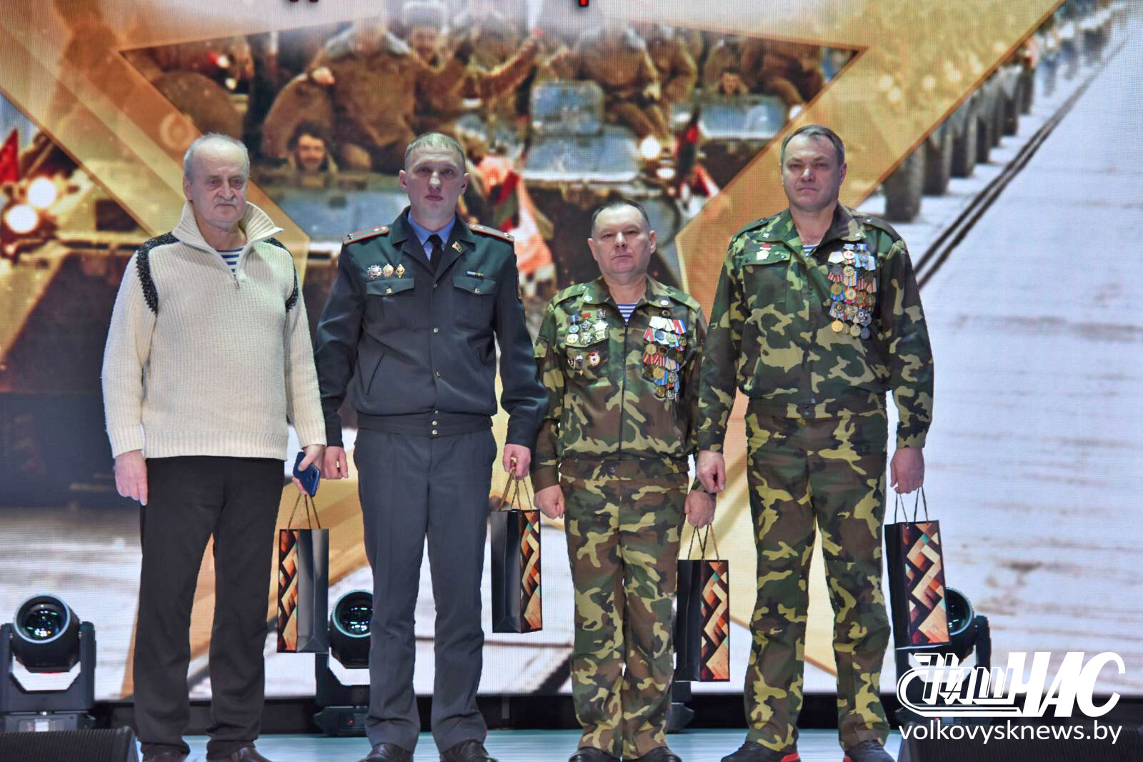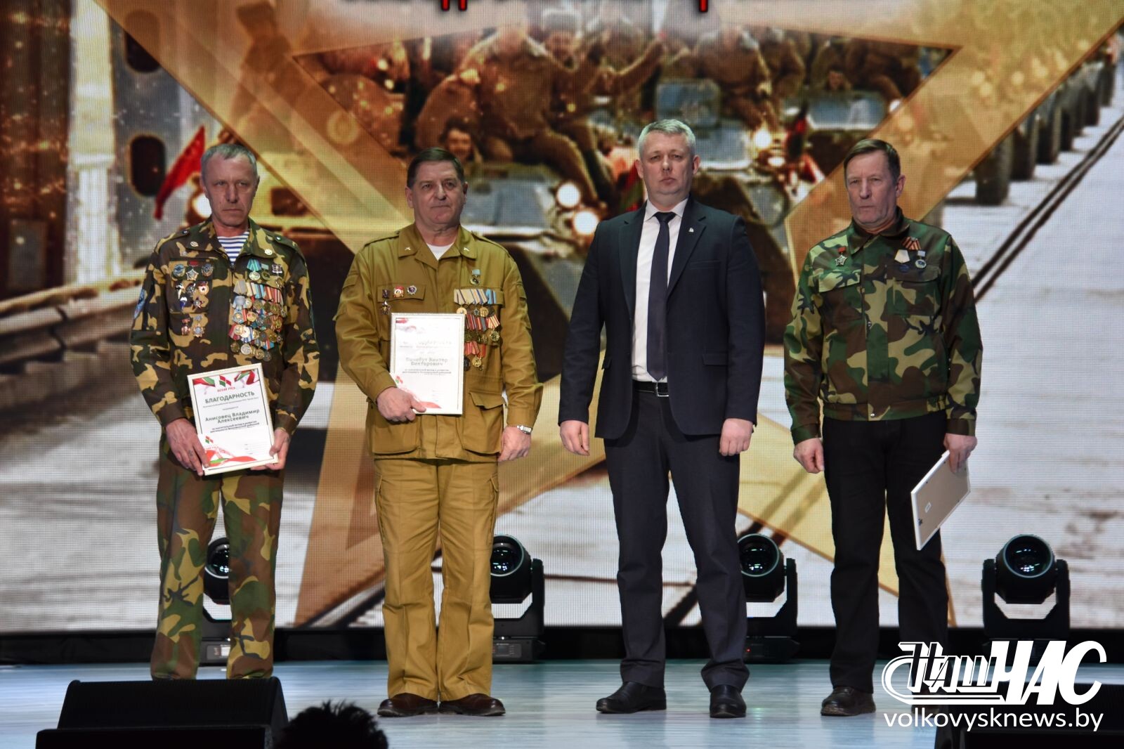Добрые слова поздравлений, благодарности и признательности звучали в адрес воинов-интернационалистов из уст военного комиссара Волковысского, Берестовицкого и Свислочского районов полковника Владимира Герасимчука, временно исполняющего обязанности начальника Волковысского районного отдела внутренних дел подполковника милиции Вадима Наливайко, председателя районной ветеранской организации Тамары Лугович, заместителя директора территориального центра социального обслуживания населения Волковысского района Светланы Моржало, председателя Волковысской районной профсоюзной организации Белорусского профсоюза работников агропромышленного комплекса Валентина Зайца, председателя Волковысской районной организации РОО «Белая Русь», главного редактора районной газеты «Наш час» Дмитрия Юшина, первого секретаря Волковысской районной организации ОО «БРСМ» Натальи Климчук. Все они награждали воинов-интернационалистов грамотами, благодарственными письмами или ценными подарками. Заместитель председателя Волковысской районной организации ОО «Белорусский союз женщин», начальник отдела загса Волковысского райисполкома Елена Новацкая чествовала вдов воинов-интернационалистов и женщин, служивших и работавших в Демократической Республике Афганистан в период нахождения там советских военнослужащих. Виктор Почебут вручил воинам-интернационалистам памятные значки в честь юбилеев различных родов войск. Исполнители и коллективы Волковысского районного центра культуры, воспитанники военно-патриотического клуба «Бастион» и другие волковысские артисты выступили с тематическими концертными номерами.