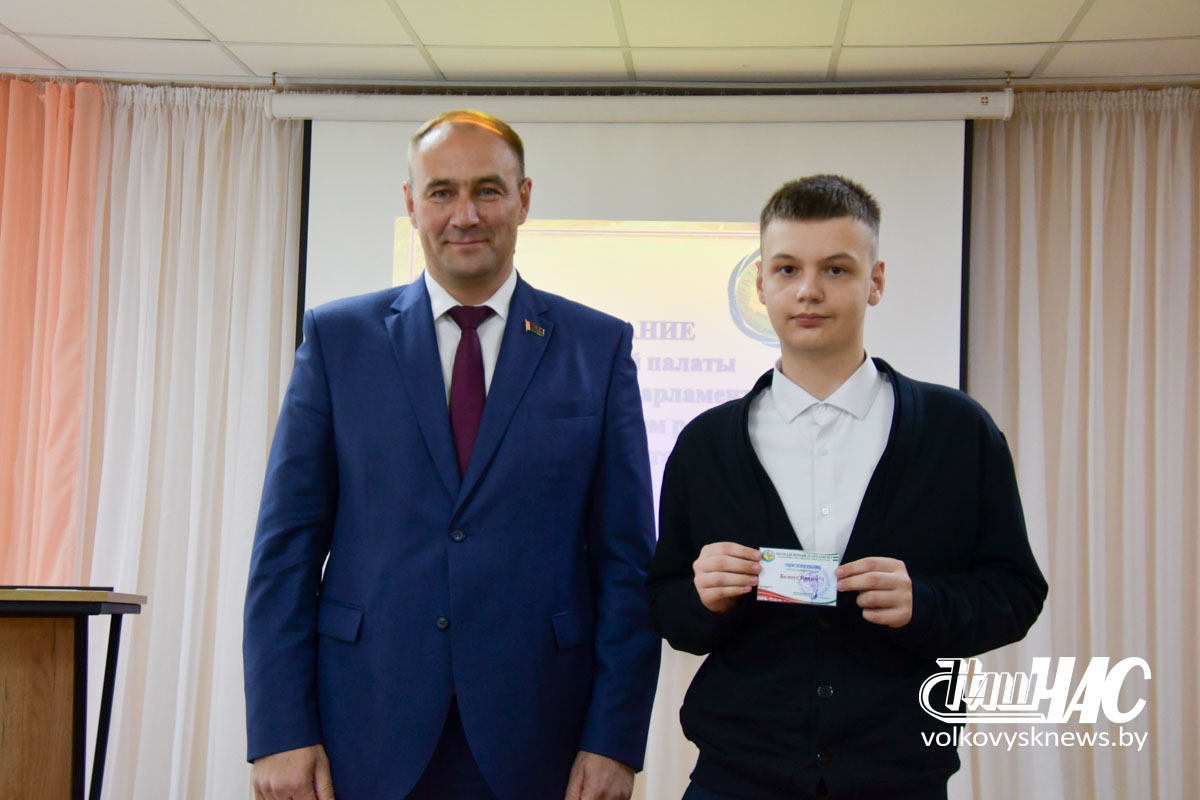 С докладом об итогах работы ученической палаты за 2024 и 2025 учебный год выступил депутат Молодежного совета (парламента) Матвей Корнелюк. Он напомнил, что Молодежный совет(парламент) при Волковысском районном Совете депутатов функционирует с 2012 года, способствуя развитию социального партнерства между органами детского, молодежного и местного самоуправления в интересах подростков:
