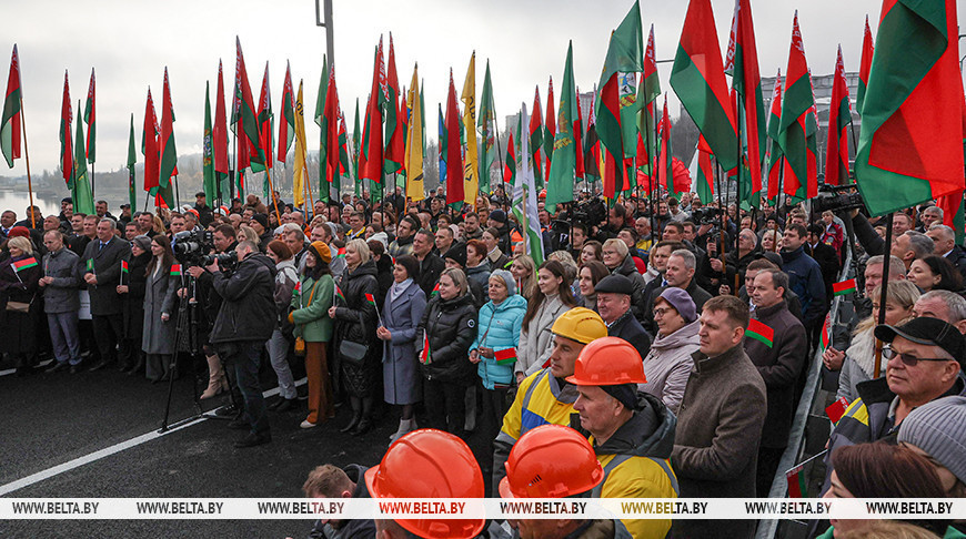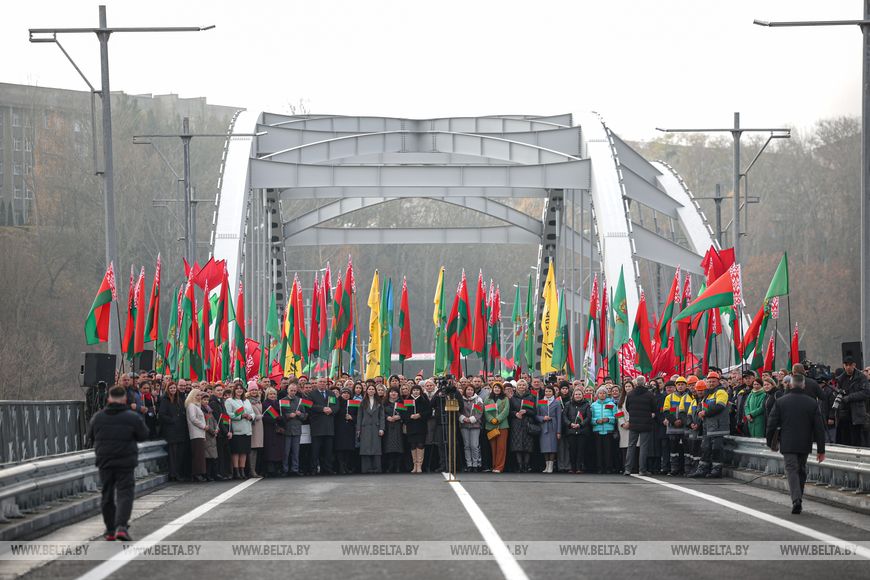 Глава государства в торжественной обстановке перерезал символическую красную ленточку. На церемонию были приглашены представители трудовых коллективов дорожных организаций, участвовавших в строительстве моста, жители Мозырского района. По сложившейся традиции ко Дню Октябрьской революции людям преподносят подарки - значимые, масштабные объекты, и обновленный мост - один из них.