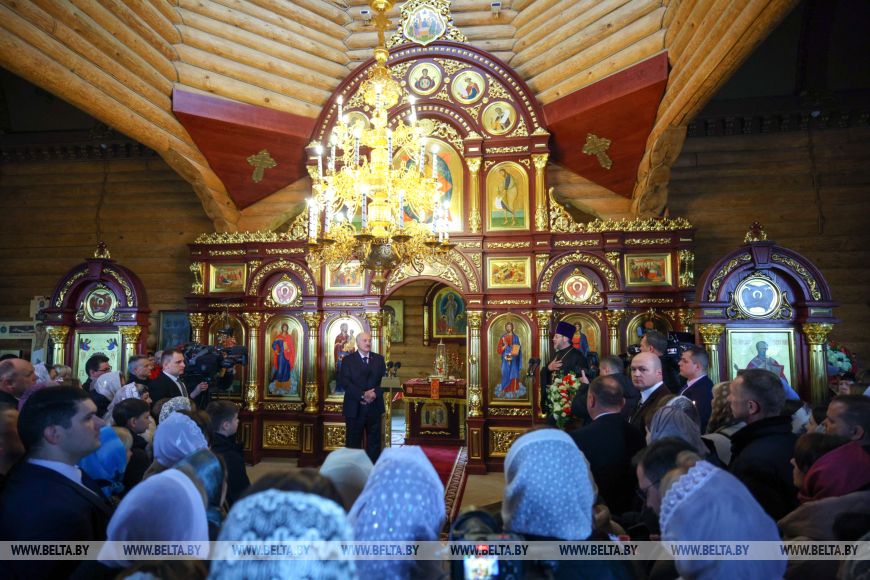 В храме белорусский лидер традиционно зажег пасхальную свечу, пообщался с прихожанами и священниками.